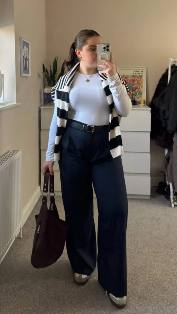 A striped long-sleeve top paired with black trousers offers a timeless look.