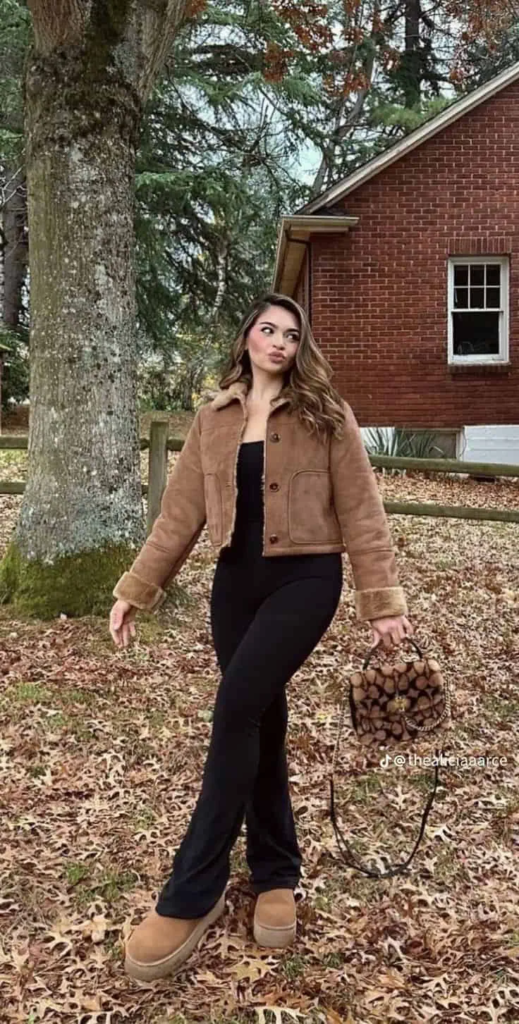 This outfit focuses on comfort while still making a statement. A black crop top and flared leggings create a smooth base, layered with an oversized olive shirt for a relaxed feel.