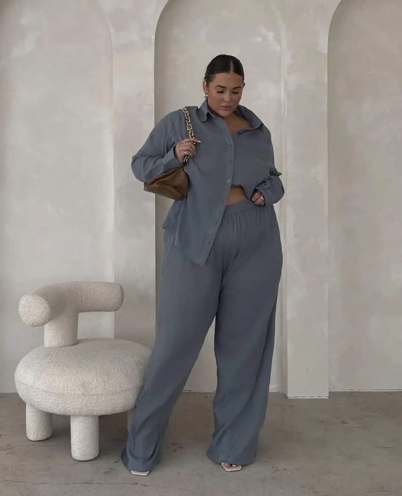 A matching color palette creates a smooth, elongated effect. The loose shirt and flowing pants move comfortably while still highlighting natural shape. Minimal accessories keep the focus on the silhouette.