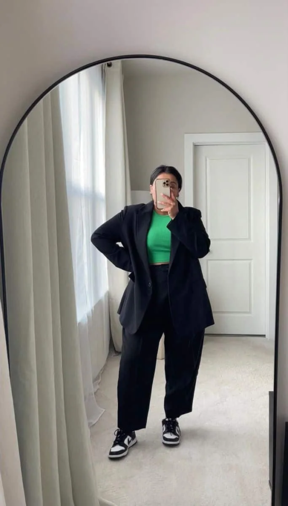 This outfit shows how mixing structured and fitted pieces creates balance for curvy figures. The oversized blazer adds shape and polish, while the dress underneath highlights natural curves. Neutral tones keep the look refined, and casual accessories make it comfortable and modern.