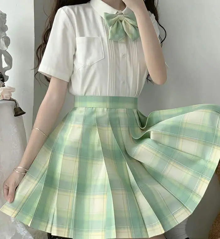 I like how this outfit feels clean and fresh without being too formal. A white shirt with a soft bow keeps it simple, while the plaid skirt adds structure.