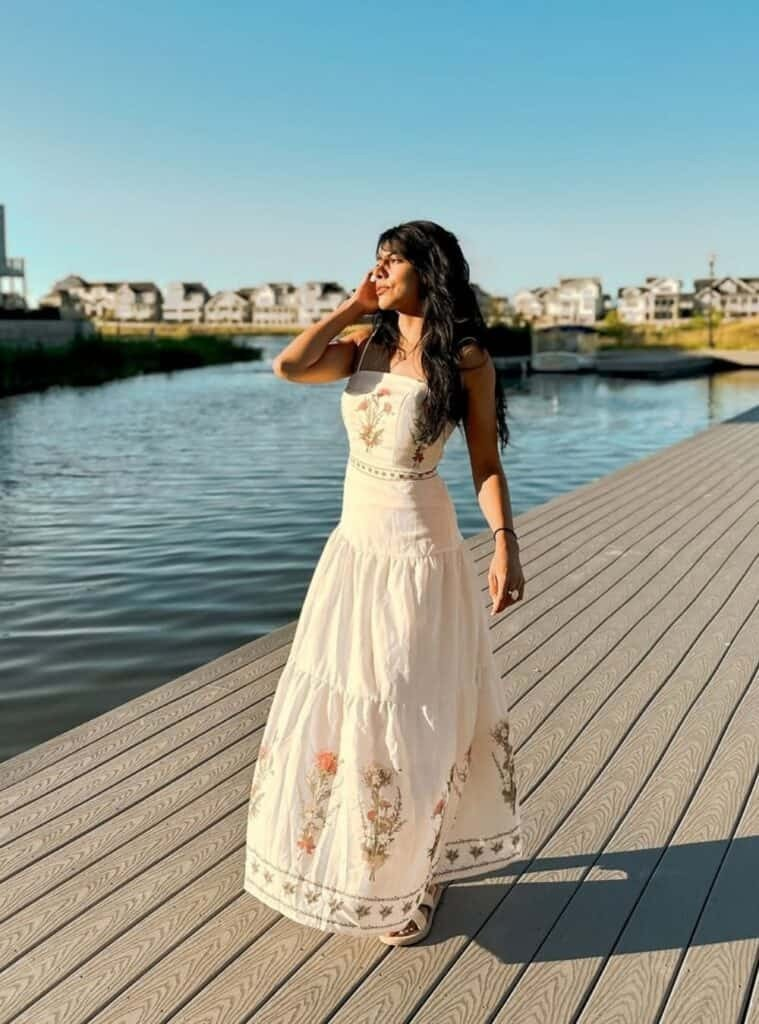 Cream maxi dresses with floral embroidery and beaded bodices offer bridal-inspired elegance. Minimal jewelry lets the outfit shine for waterfront dinners or special occasions.