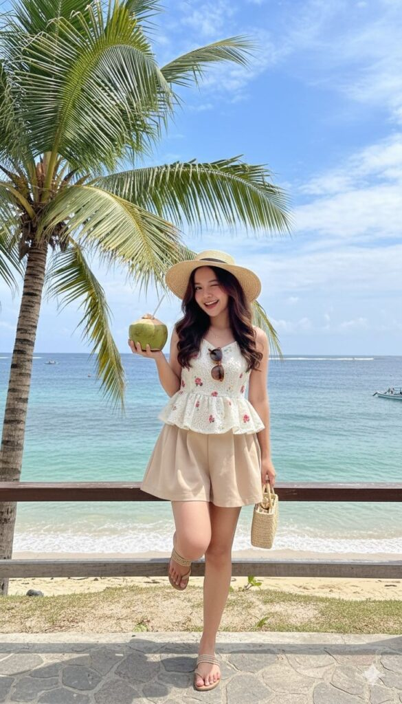 Cream shorts with floral peplum tops balance polish and comfort. Straw hats and woven bags add effortless beach-day charm.