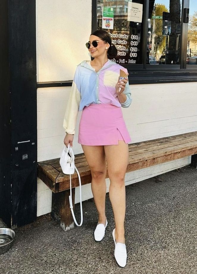 Soft pastel color-blocked button-ups with matching mini skirts offer coordinated elegance. White slip-on sneakers and round sunglasses keep it approachable for everyday activities.