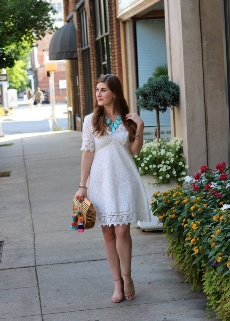 White eyelet dresses with lace trim feel boutique-worthy. Pairing with a turquoise statement necklace and woven bag adds personality for brunch or casual strolls.