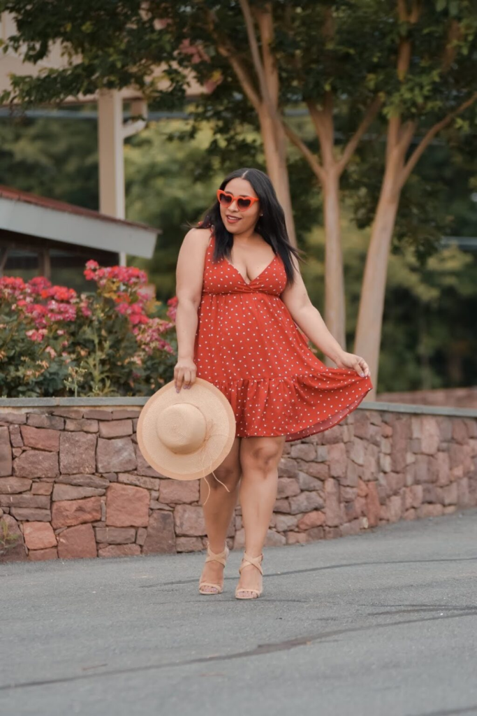 Rust-red halter dresses with polka dots create retro-romantic vibes. Structured empire waists and nude sandals elevate weekend getaway looks.