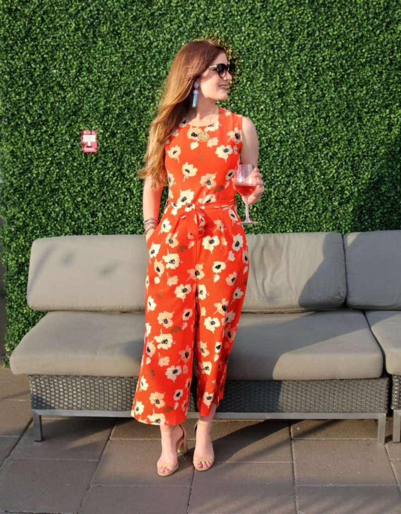Vibrant red midi dresses with floral prints balance garden party polish with approachable cool. Simple sandals and cat-eye sunglasses complete the effortless look.