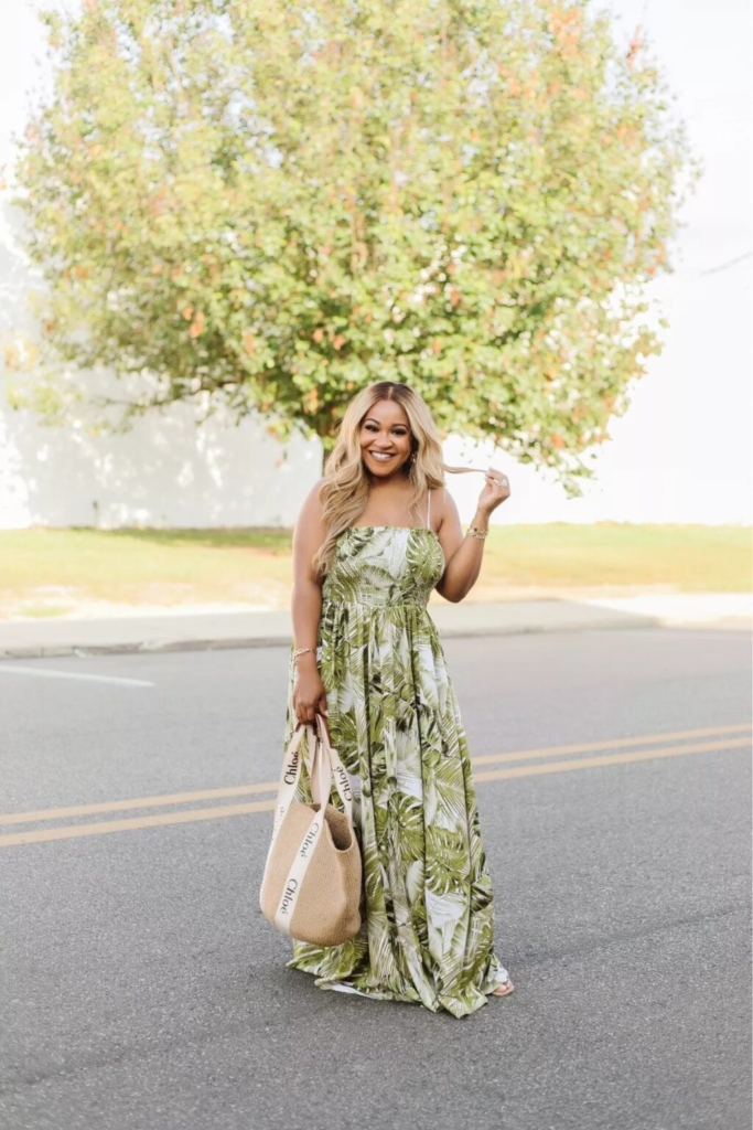Cream and sage strapless maxi dresses read like high-end resort wear. Neutral accessories keep the outfit grounded for brunches or farmers market strolls.