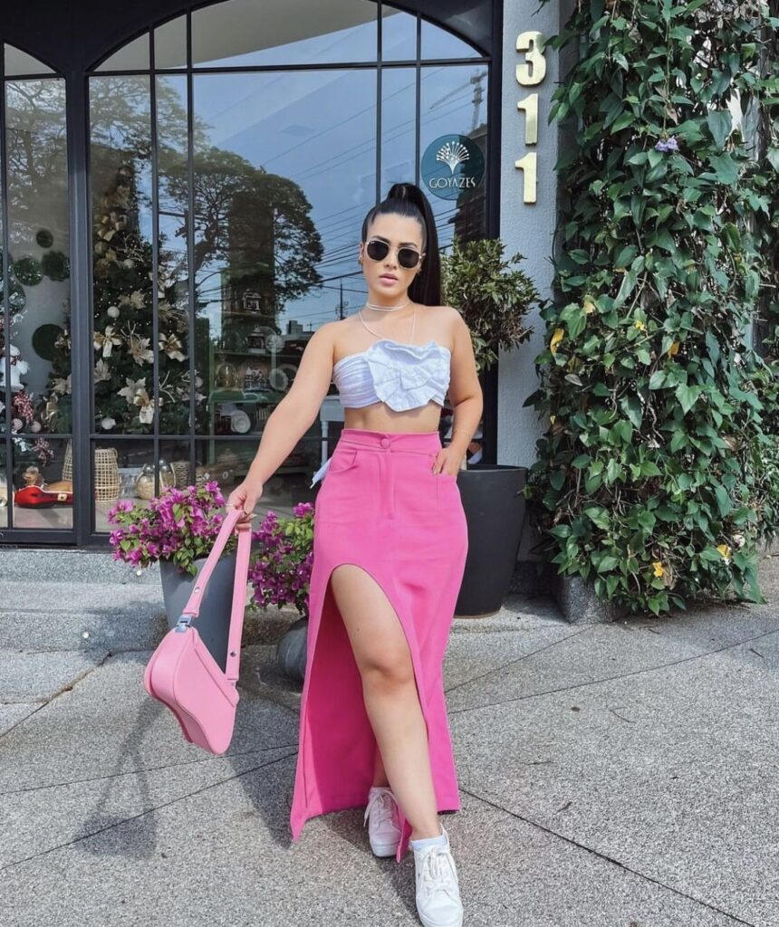 Periwinkle ruched crop tops paired with hot pink maxi skirts and white sneakers make a striking statement. Round sunglasses and monochromatic accessories tie the look together for weekend shopping or casual meetups.
