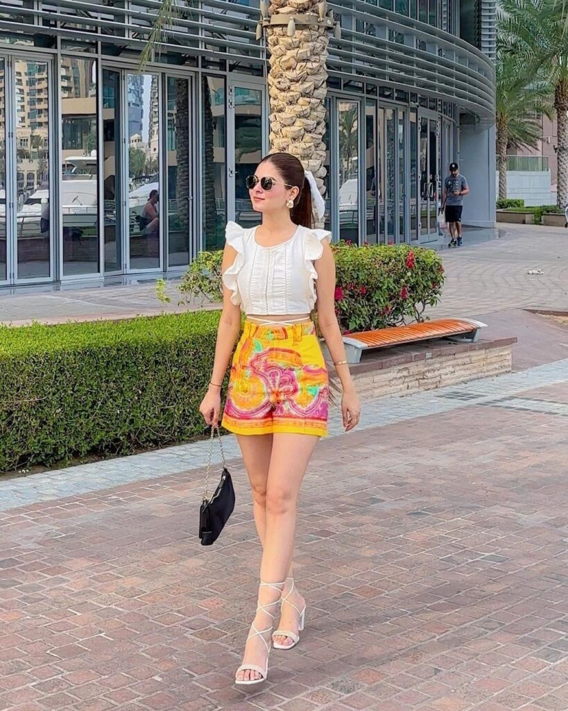 A ruffled white crop top paired with bold abstract-print shorts in yellow and magenta adds instant polish. White strappy sandals and a black mini bag balance the outfit, making it ideal for shopping trips or coffee dates.