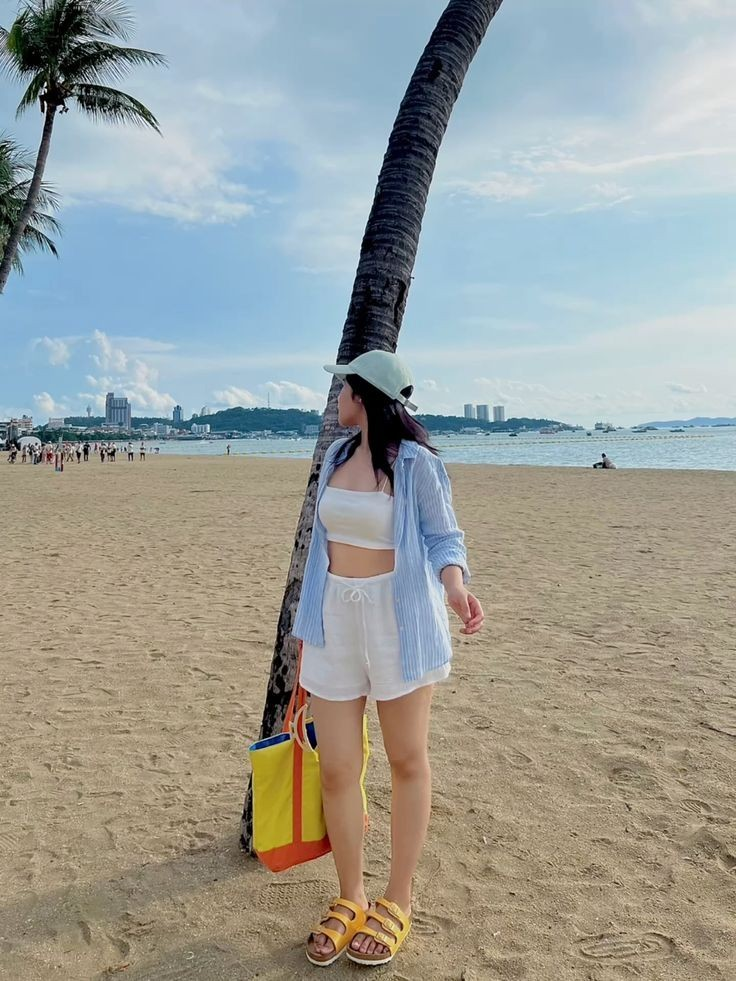 Oversized striped shirts layered over a white crop top and matching shorts create a relaxed yet put-together vibe. Bucket hats, yellow slides, and color-blocked totes make this an easy beach-ready outfit that looks pricier than it is.
