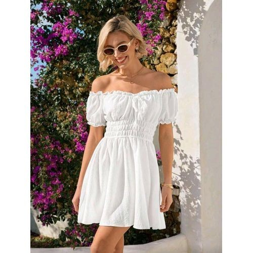 Off-shoulder white dresses with puff sleeves feel designer-level, especially when paired with gold jewelry and oval sunglasses. Perfect for brunch, casual dates, or Instagram moments, this outfit shows you can look effortlessly pulled together on a budget.