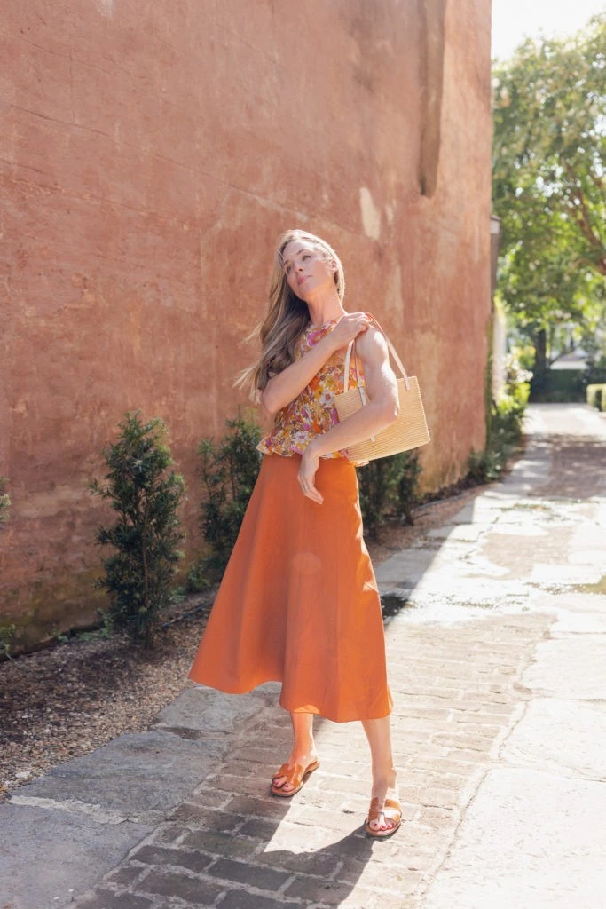 A burnt orange midi skirt adds warmth and richness to the outfit. It pairs naturally with a floral top in similar earthy tones. A woven tote bag and terracotta sandals complete the coordinated look. The outfit feels relaxed and perfect for daytime outings.