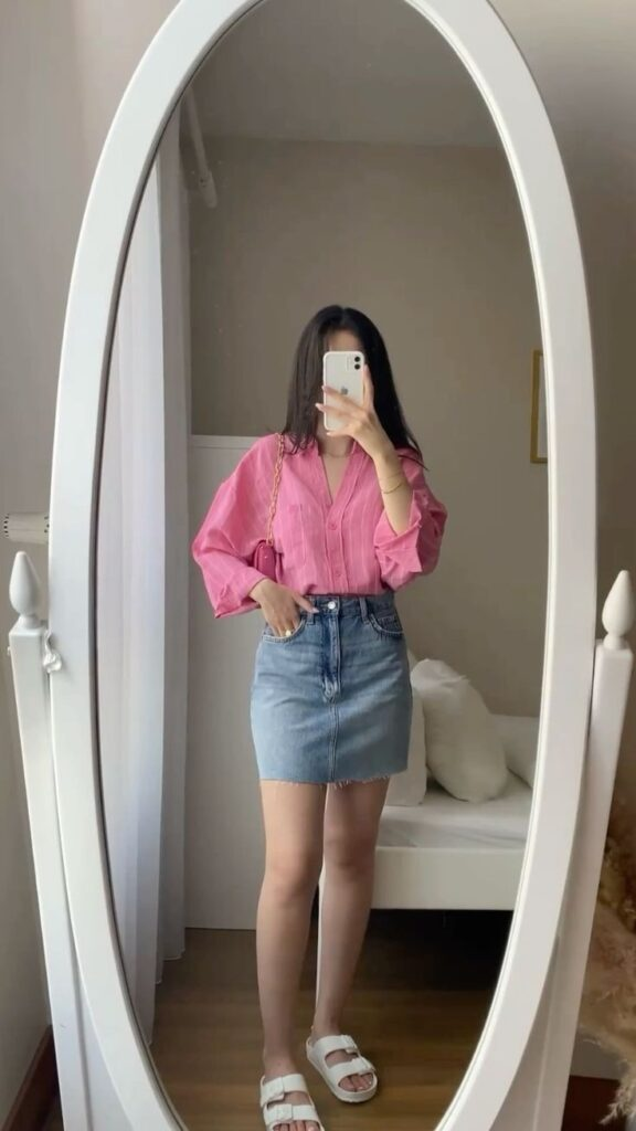 11. Pink Shirt, Denim Skirt Energy