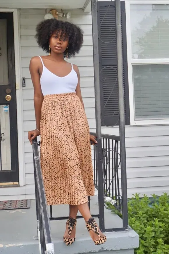A pleated midi skirt in warm caramel tones with subtle leopard spots adds bold character. A fitted white tank keeps the look balanced and simple. Leopard flats continue the pattern in a stylish way. The outfit feels polished while still easy to wear.