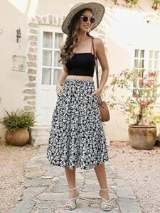 A black and white floral midi skirt adds texture and pattern to the outfit. A simple black crop top balances the print and keeps the look clean. White sandals add comfort and keep the outfit light. A straw hat gives the outfit a relaxed summer vibe.