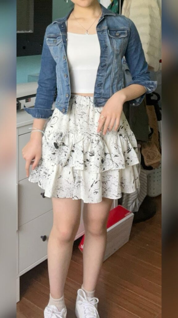 A cream midi skirt with abstract line prints brings personality and interest to the outfit. A fitted white crop top keeps the silhouette balanced and simple. Adding a vintage-wash denim jacket gives the look a relaxed edge. White sneakers keep the outfit practical for casual outings and daily activities.