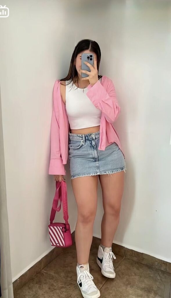 A classic denim mini skirt works perfectly with a cropped white tank for an easy everyday look. The soft pink cardigan adds color and makes the outfit feel more styled without trying too hard. White high-top sneakers keep the outfit casual and comfortable. A pink crossbody bag ties everything together and makes the outfit feel coordinated.