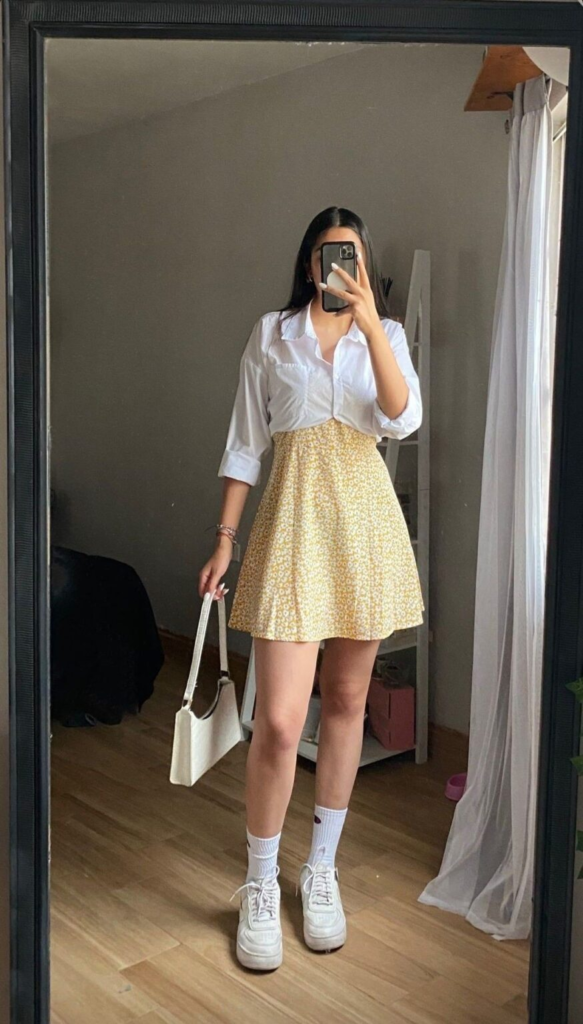A soft yellow floral midi skirt becomes the highlight of this look and adds charm to warm-weather outfits. Pairing it with a crisp white button-up keeps the style clean and polished. Chunky platform sneakers with crew socks add a playful modern touch. A cream tote finishes the outfit and keeps the overall look balanced and easy to wear.