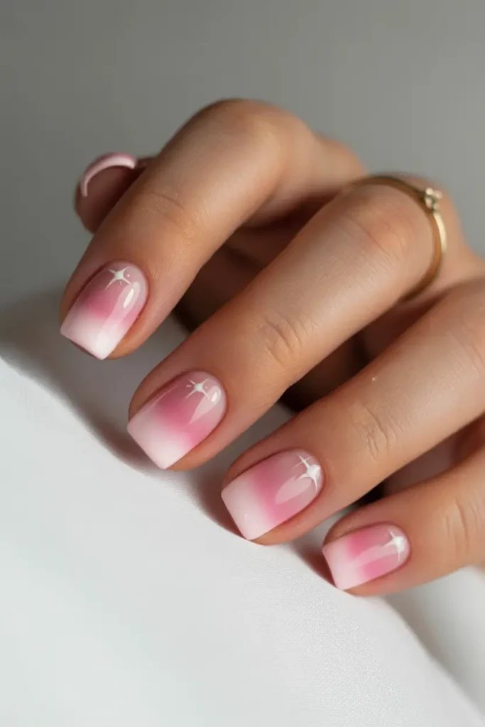 Pink-to-white ombre nails with tiny sparkles create a gentle, optimistic look. Square nails keep the style structured while remaining light and fresh.