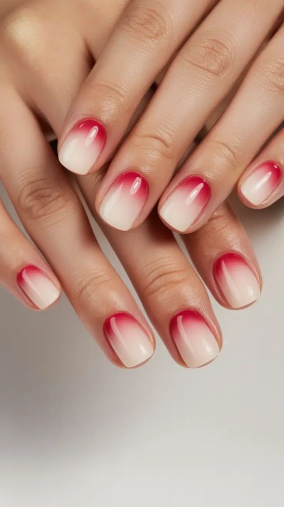 A delicate ombre from nude to soft red offers a romantic, understated look. Short natural nails make it practical and timeless, ideal for February occasions.