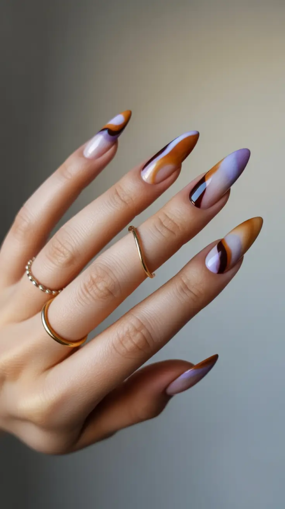 Soft caramel and lilac swirls on almond nails create a playful, artistic design. Subtle enough for daily wear, it adds a creative touch to winter nail ideas.