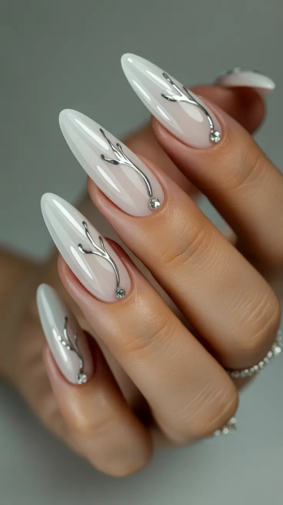 Soft milky white nails with delicate silver branch art and tiny crystals feel refined and ethereal. This timeless manicure works well for events or everyday elegance.