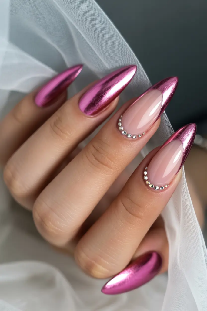 Vivid pink chrome nails with nude accents and crystal-lined cuticles feel luxurious without excess. This design pairs boldness with restraint, suitable for grown-up February nail inspiration.