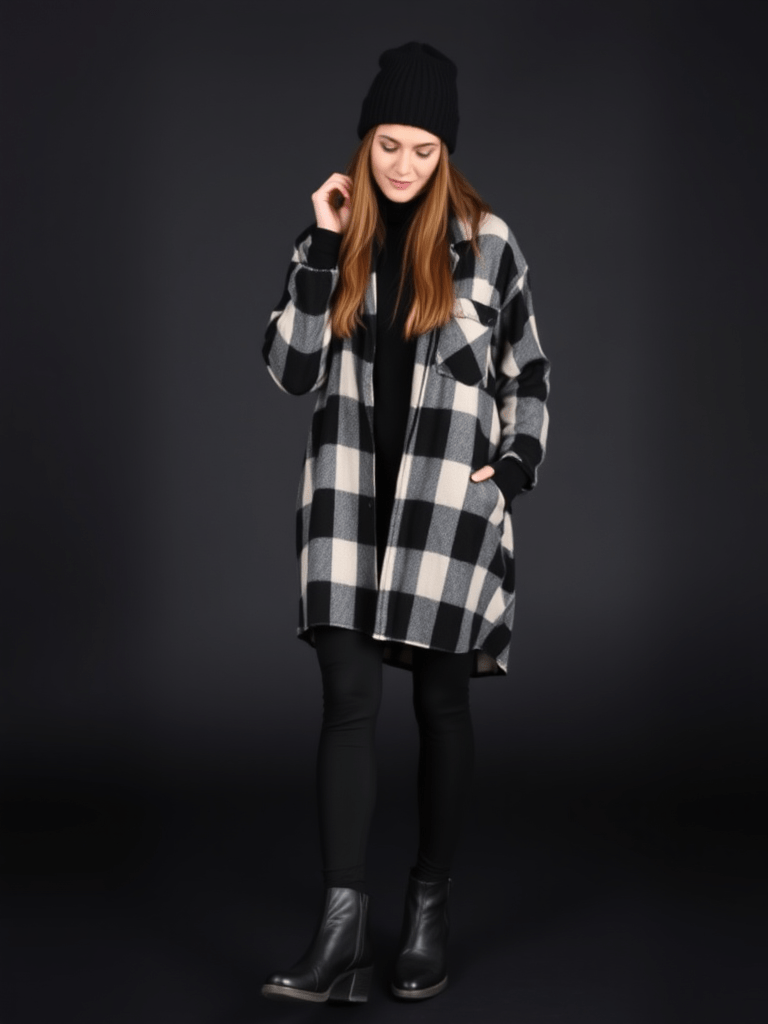 The focus here is on a relaxed, comfortable outfit that embraces classic fall patterns and easy styling.