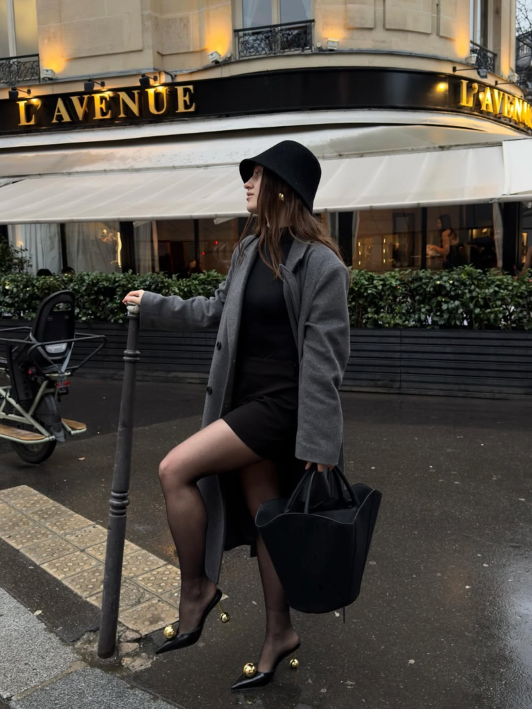 This look uses a simple black dress and a structured gray coat to create a polished outfit suitable for rainy city days. The monochrome palette keeps it sharp while small details add sophistication, making it ideal for creative work settings or evening plans.