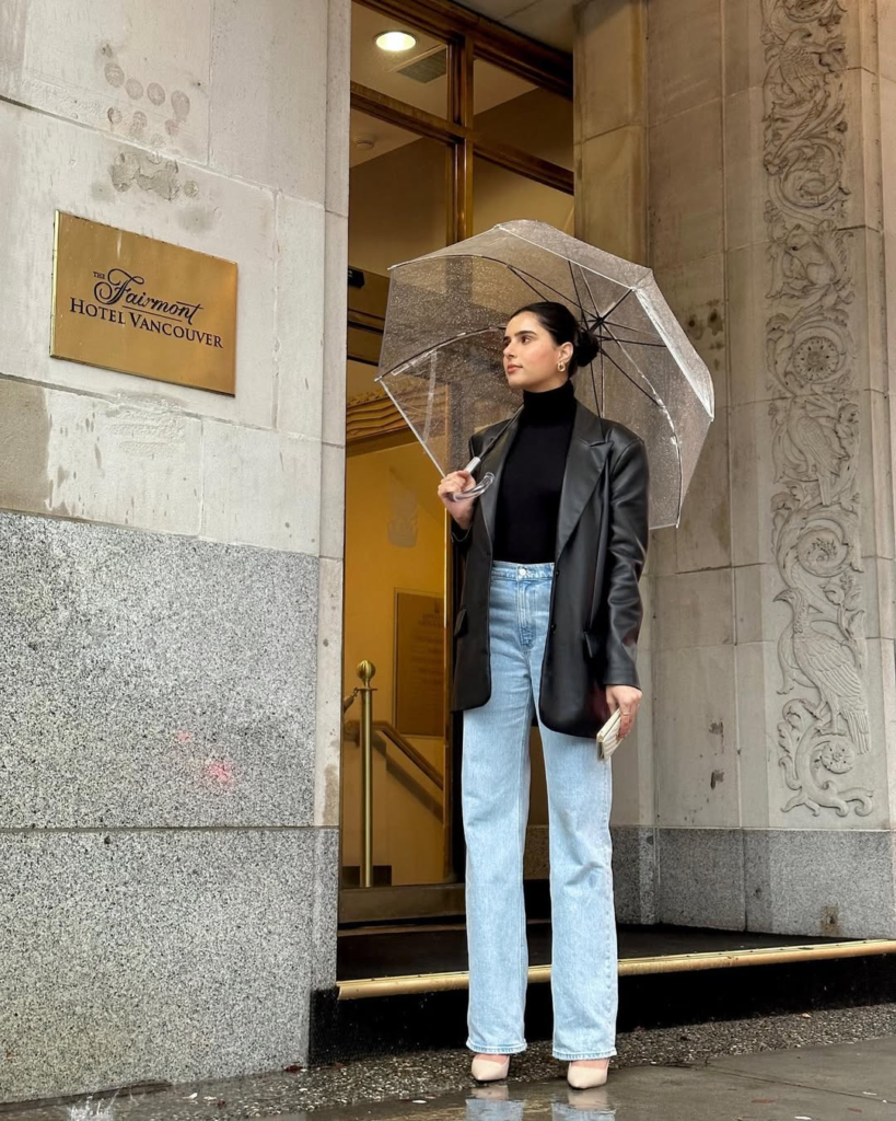 4. Leather Blazer & Denim: Rain-Proof Smart Casual