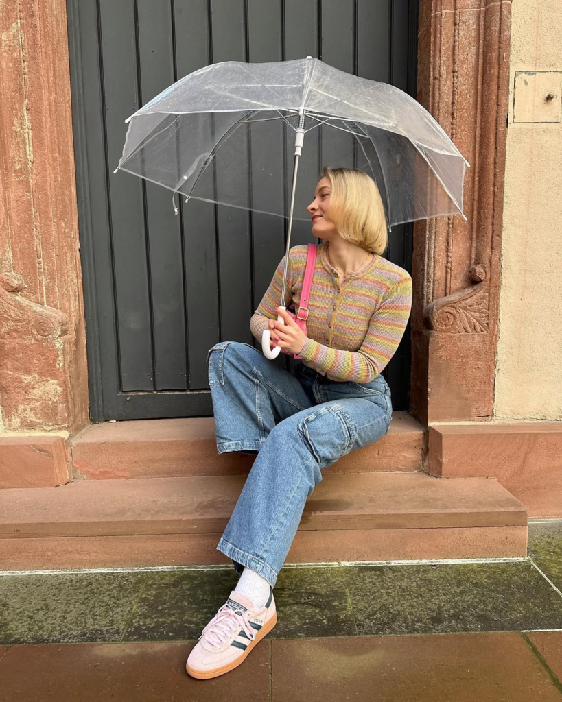 Pastel tones brighten rainy days while fitted knits and relaxed denim keep the outfit grounded. This look shows that spring rain outfits can feel light, playful, and practical at the same time.