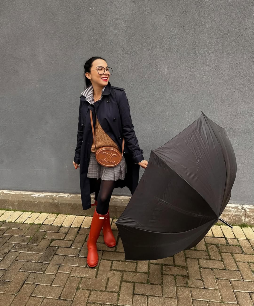 This outfit combines classic layers with bold rain boots to add personality. The structured trench keeps it polished while the color brings energy to gray weather.