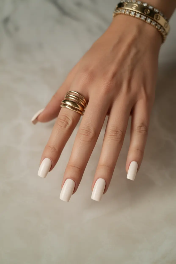 Milky white nails create a crisp and modern appearance. The creamy tone offers a softer alternative to bright white polish, which makes it especially flattering for pale skin. The square shape adds a structured look that keeps the manicure contemporary.