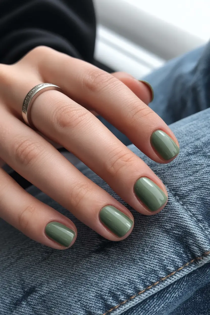 Muted olive green might not be the first color that comes to mind for spring, but it can be surprisingly flattering on pale skin. The earthy tone creates a calm contrast while still feeling connected to the season. Combined with short rounded nails, the overall style appears relaxed and modern.