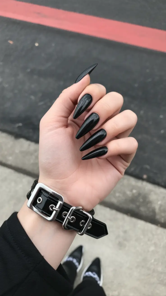 Black nails may not seem like a typical spring choice, but they can create a striking contrast on pale skin. The glossy finish enhances the deep color while the sharp stiletto shape adds drama and elegance.