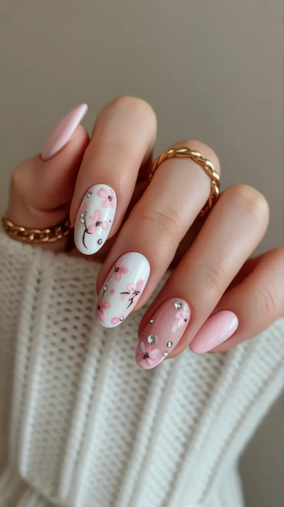 Soft pink nails decorated with delicate flowers create a romantic spring look. The gentle base color blends beautifully with pale skin, while the floral details add charm and elegance. Small decorative accents give the manicure a refined finish.