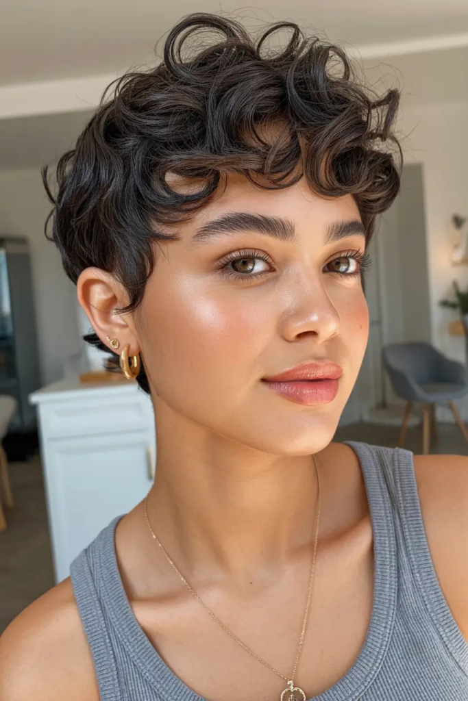 Short Brunette Pixie With Curly Texture and Bold Personality