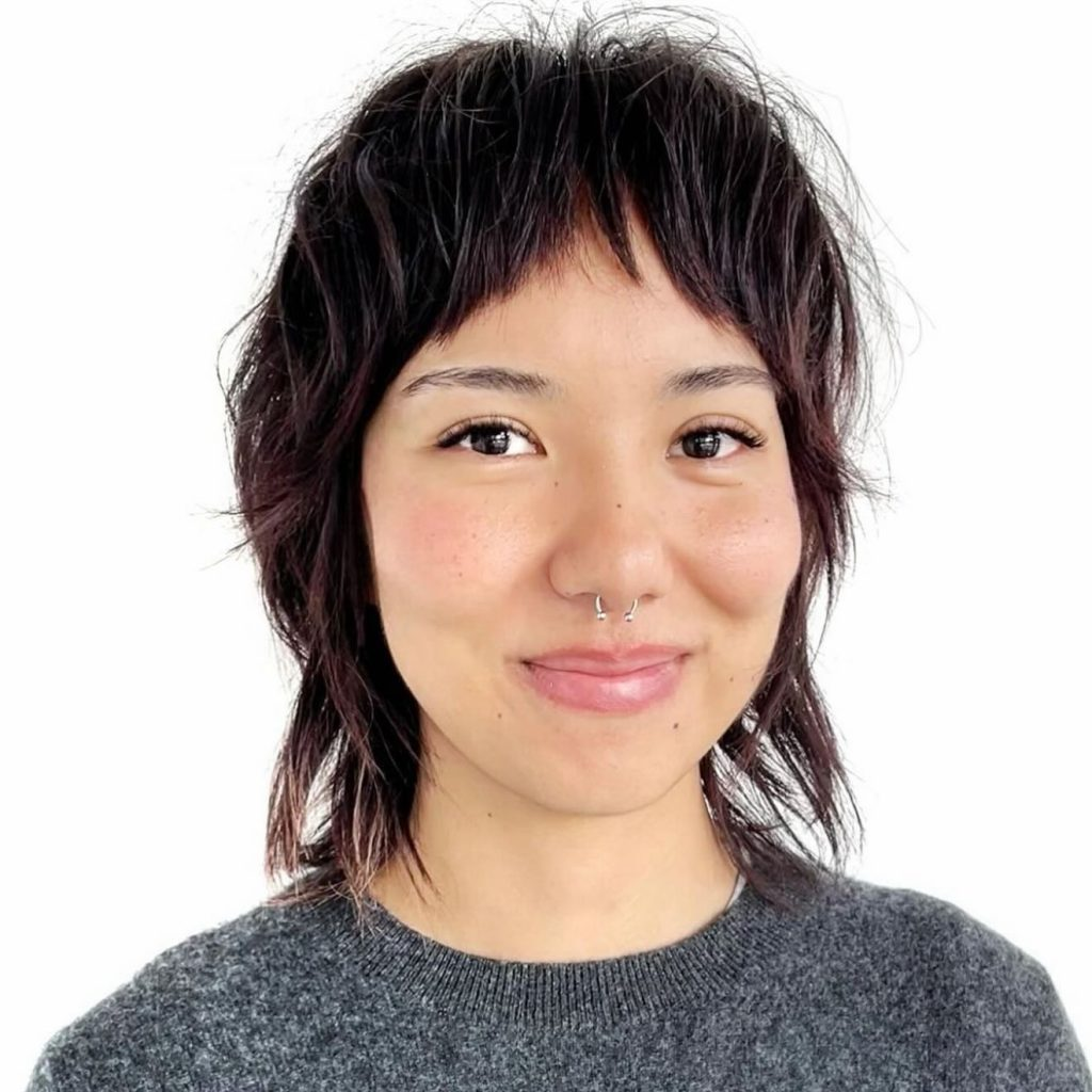Featuring sharp bangs and textured layers, this haircut leans into darker, expressive styling. It adds shape to thick hair while creating a strong, fashion-forward appearance.