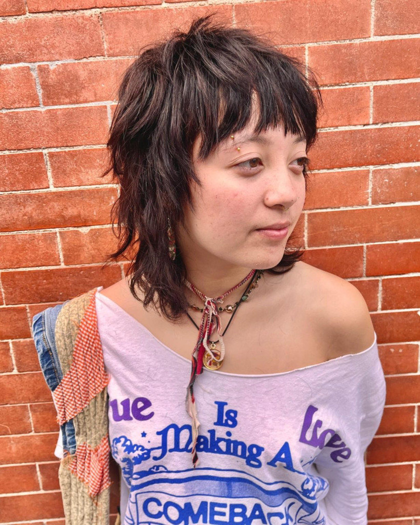 Uneven layers and textured ends define this bold hairstyle. It offers a carefree, expressive look that feels intentional without appearing overly styled.