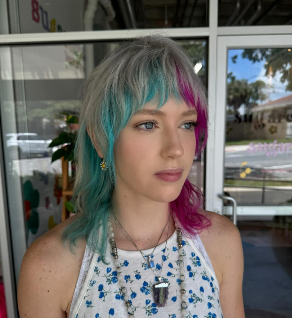 This short, colorful shag focuses on movement and texture while maintaining a fun, youthful feel. It’s well-suited for fine hair and makes a strong visual statement.