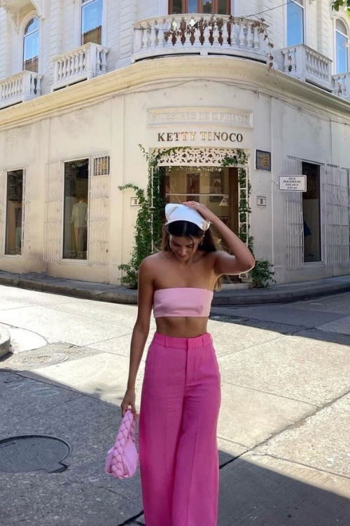A satin tube top combined with loose wide-leg pants creates a stylish but comfortable vacation look. The shiny texture of satin adds a little elegance, while the flowy pants keep the outfit light and easy to wear. This combination works well for evening plans like sunset drinks or rooftop dinners, especially when paired with bright tropical colors.