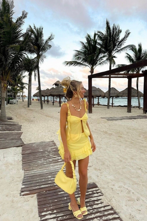 A waistcoat styled with a mini skirt creates a sharp and stylish outfit that feels slightly different from typical beachwear. The fitted pieces give the look a confident and polished feel. It’s a great option for evenings out when you want something chic but still comfortable.