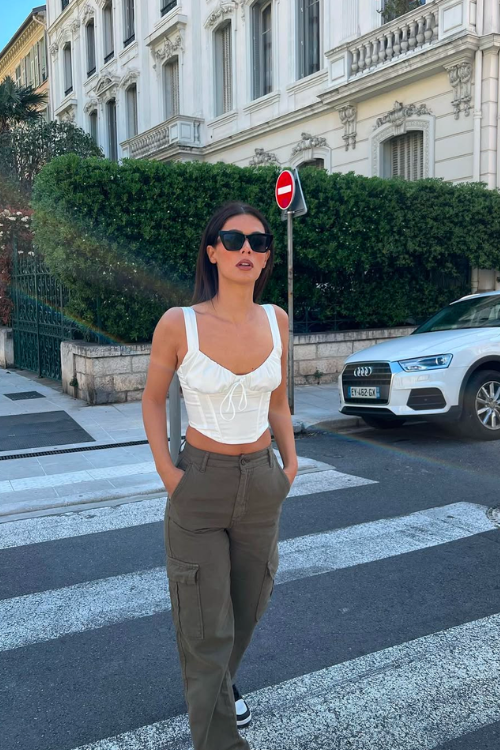 A corset top styled with loose cargo pants creates a mix of feminine and edgy style. The structured top contrasts with the relaxed fit of the cargos. This outfit works well for exploring different spots around the city.