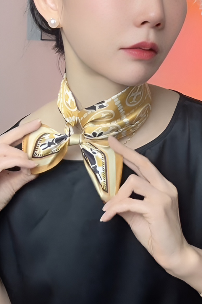 Folding a scarf lengthwise and knotting it at the front adds a formal, elegant touch to suits, dresses, or blazers.