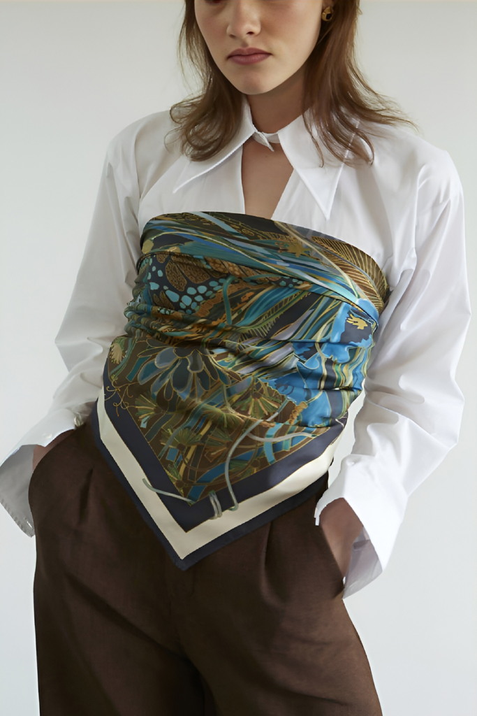 Knotting a square scarf at the front around the neck creates a cropped, tailored effect for high-waisted bottoms or dresses.