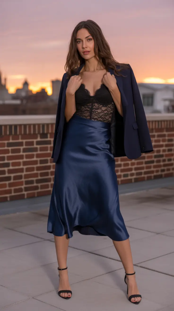 This look blends elegance with softness through satin and lace, creating an outfit that feels refined without being too formal. The smooth fabric and delicate textures make it ideal for cool spring evenings when you want to look polished but relaxed.
