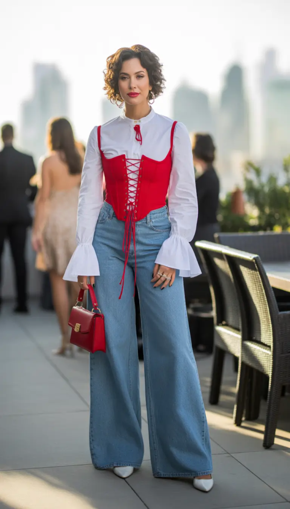 Blending romantic elements with denim keeps this outfit modern and wearable. The corset adds interest while the jeans keep it grounded.