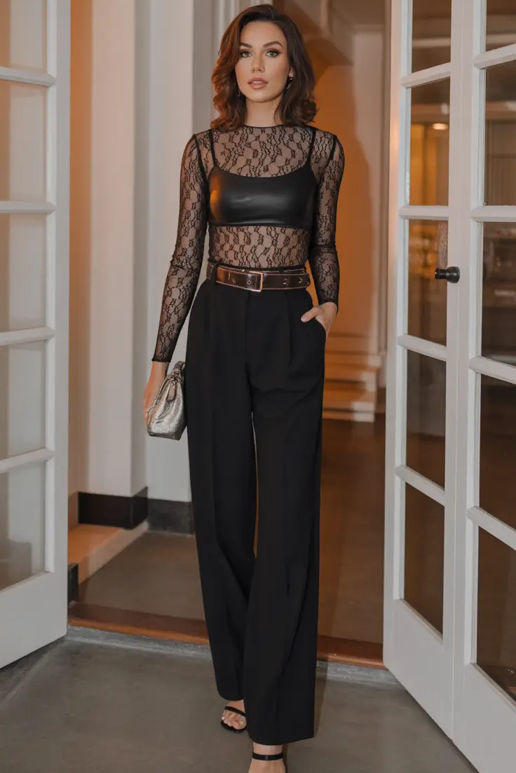 This outfit uses texture instead of color to make an impact. Lace softens the look, while tailored pants keep it polished.