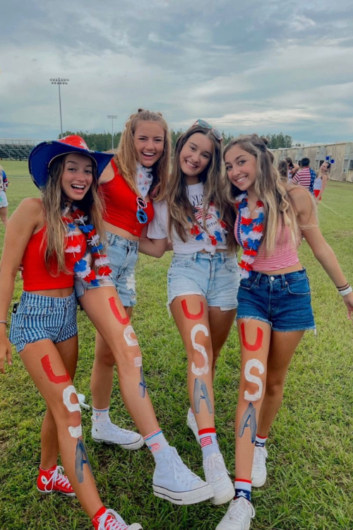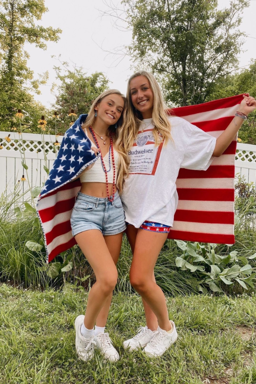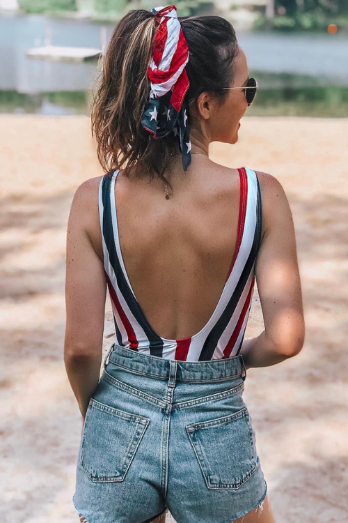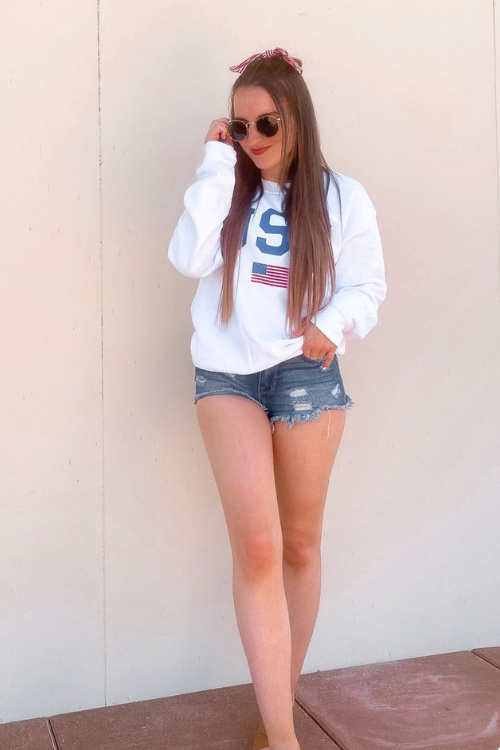 A simple tank top with denim shorts is a timeless summer combo. It’s easy, relaxed, and perfect for a backyard gathering or park hangout. White sneakers complete the laid-back patriotic vibe.